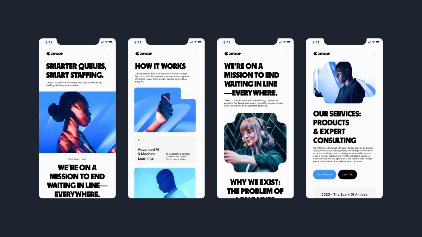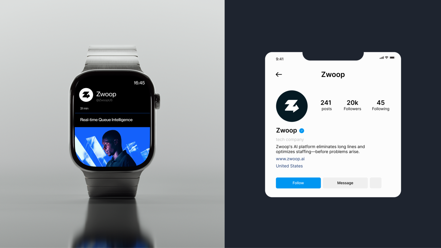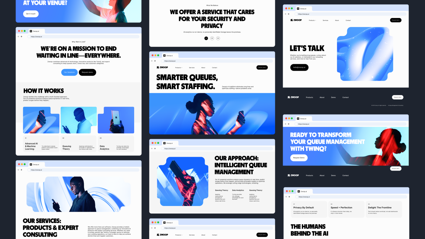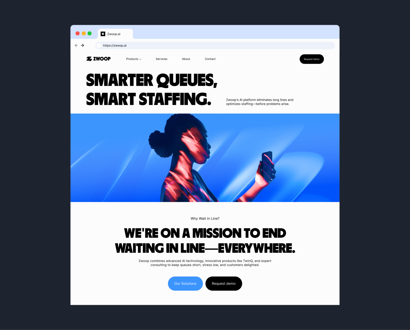 Zwoop Smart prediction, smart staffing. Zwoop is a new platform that eliminates long lines and optimizes staffing before problems arise. Their AI-powered solutions analyze queue dynamics in real-time, predict surges before they happen, and provide actionable insights to optimize operations. By combining advanced AI technology, innovative products like TwinQ, and expert consulting, Zwoop can keep queues short, stress low, and customers delighted.